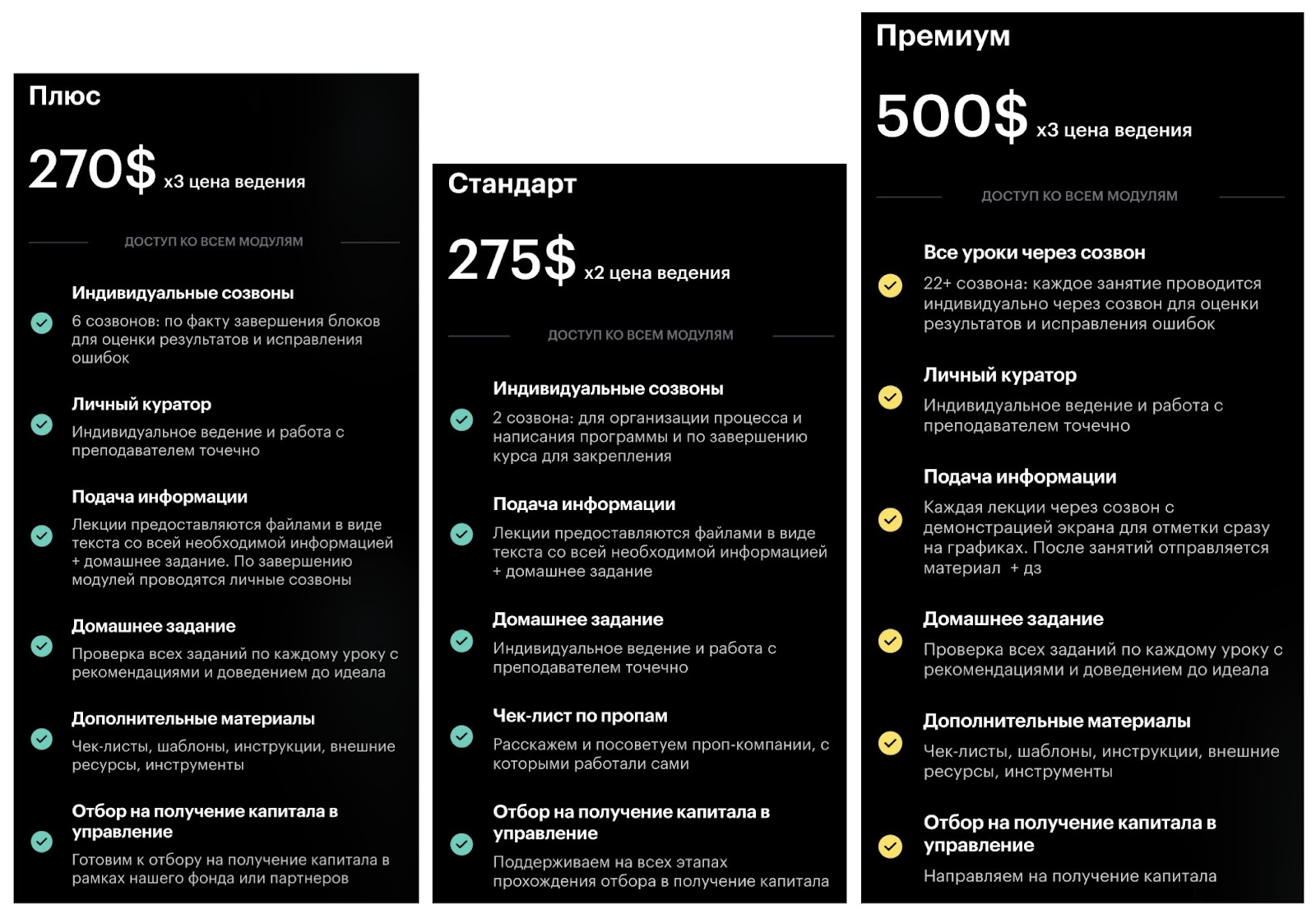 Ценник зависит от тарифа, всего их три. Студенты, которые заплатят $500, получат в свое распоряжение личного куратора и бонусные материалы.