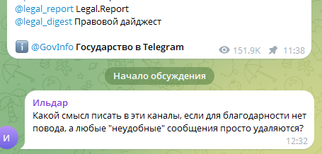 Наши догадки подтверждает график роста/убыли подписчики с аномальными скачками в 2,5 раза за 1-3 дня и такими же резкими спадами. Комментарии здесь – большая редкость, а те, что появляются, пропитаны скепсисом. Например, когда в канале публикуют контакты госорганов, люди резонно замечают, что писать туда бессмысленно. В общем, у них нет особого повода для благодарности, а любая критика или неудобные вопросы оперативно вычищаются модераторами.