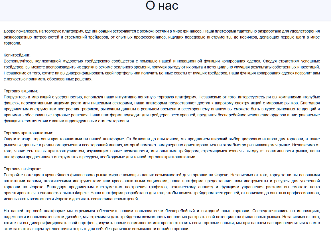 В разделе “О нас” ожидалось увидеть данные об основании компании, ее истории, размещении. Также здесь можно было разместить информацию о руководителях фирмы, рассказать об их опыте. На деле мы получили еще один текст, состоящий из “воды”. Здесь клиентам рассказывают о том, что такое копитрейдинг, торговля акциями, криптовалютами и т.д.