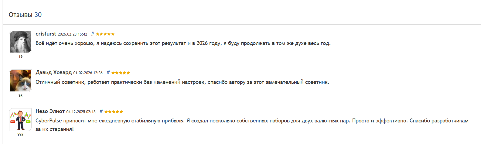На странице MQL5 Market у Cyber Pulse порядка 23 отзывов, из которых часть пользователей ограничивается только оценкой звездами и короткими комментариями. При этом есть несколько человек, которые подчеркивают, что бэктест не является гарантией прибыли, а один из них отмечает, что робот “слишком плох”.