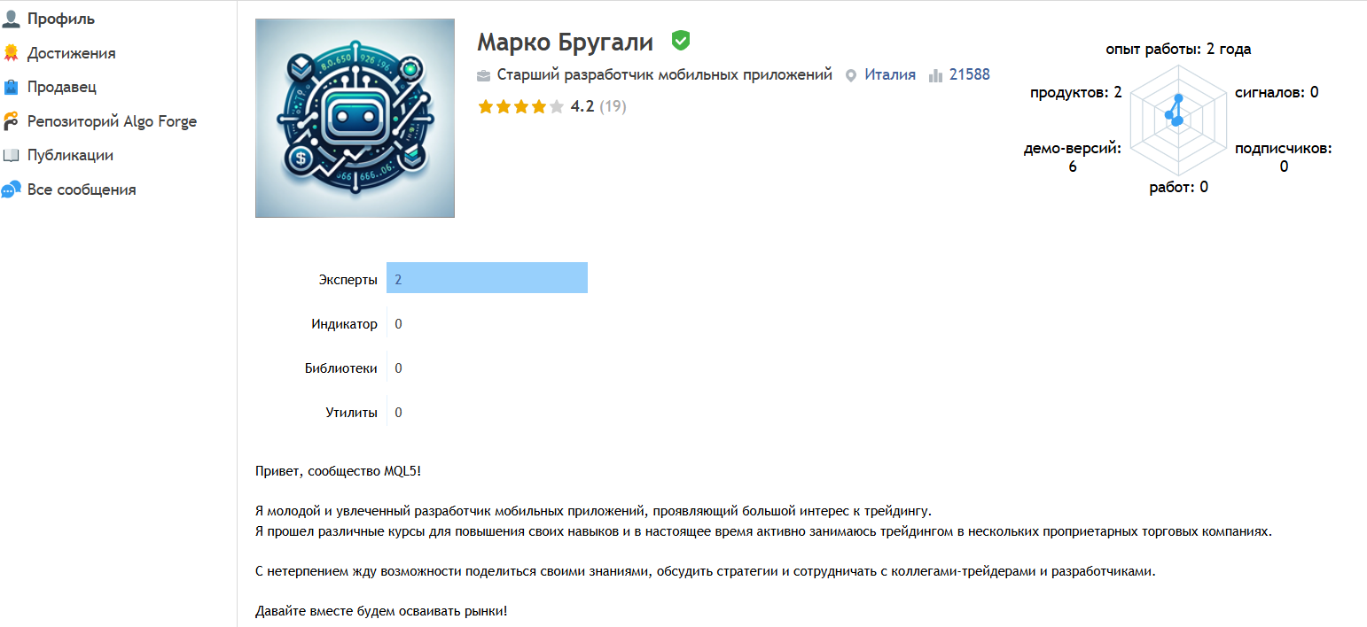 Индивидуальный профиль автора на MQL5 Market не дает подтвержденного опыта в крупных финансовых компаниях или публичных стратегиях, а оценки и отзывы о Cyber Pulse доступны только для тех, кто уже купил или арендовал продукт. Это означает: нет независимой проверки “бэкграунда” разработчика, а доверять приходится только описанию и тем отзывам, которые проникают в публичную часть.