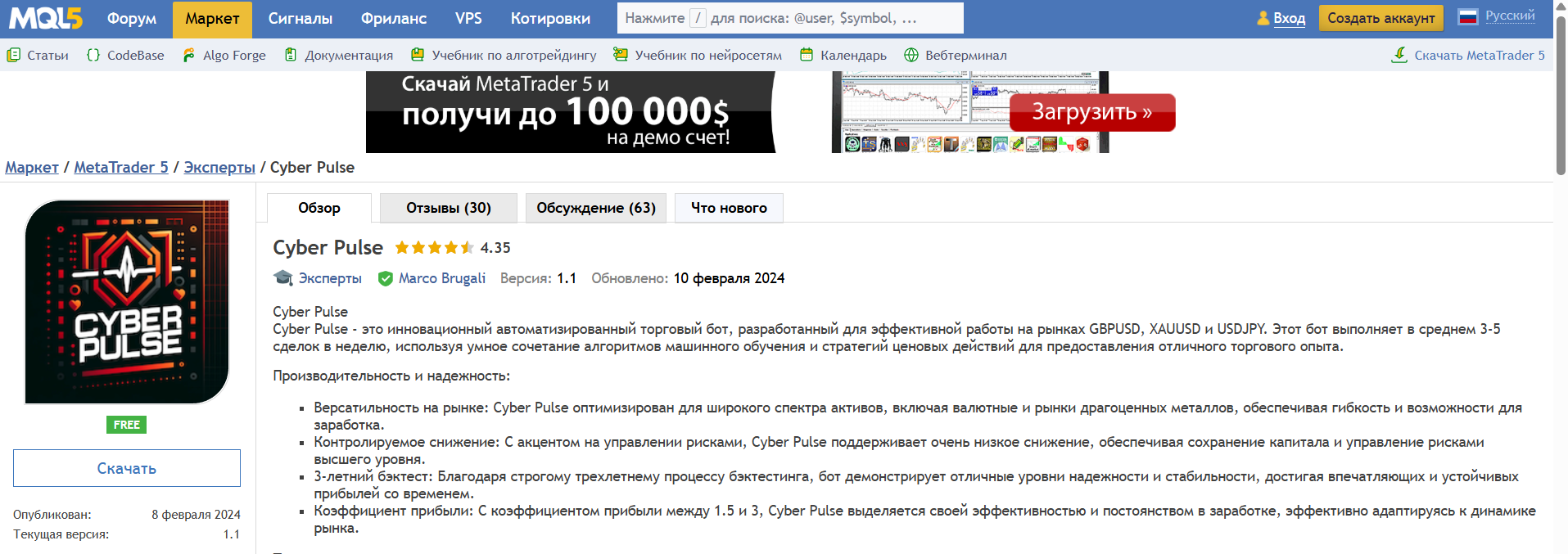Cyber Pulse — это эксперт‑советник (EA) для MetaTrader 5, размещенный в разделе MQL5 Market под авторством трейдера Marco Brugali. На странице площадки скрипт описывается как автоматизированный торговый бот с интеграцией алгоритмов машинного обучения и технического анализа. Версия 1.1 на момент последнего обновления от 10 февраля 2024 года доступна как для покупки, так и для аренды, что типично для платформы MQL5.