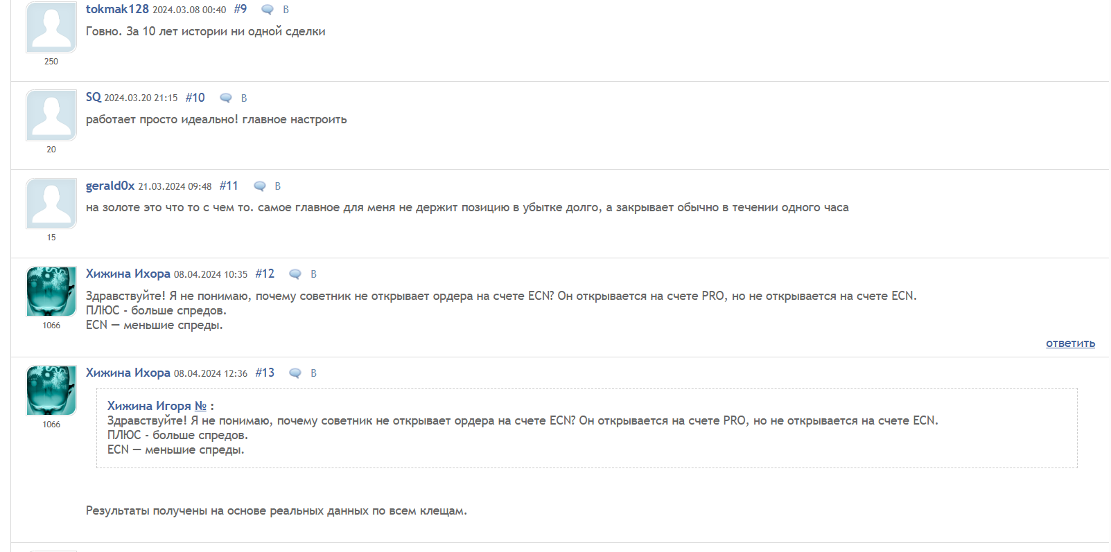 Разброс по тональности очень заметен: от эйфорийных до требований улучшить работу на маленьких депозитах или добавить ограничение торговых часов. Среди плюсов — хорошие результаты на отдельных таймфреймах и парах, особенно в M5, а среди минусов — крупные просадки, необходимость ручной коррекции и сомнения в релевантности трехлетнего бэктеста для реального рынка.