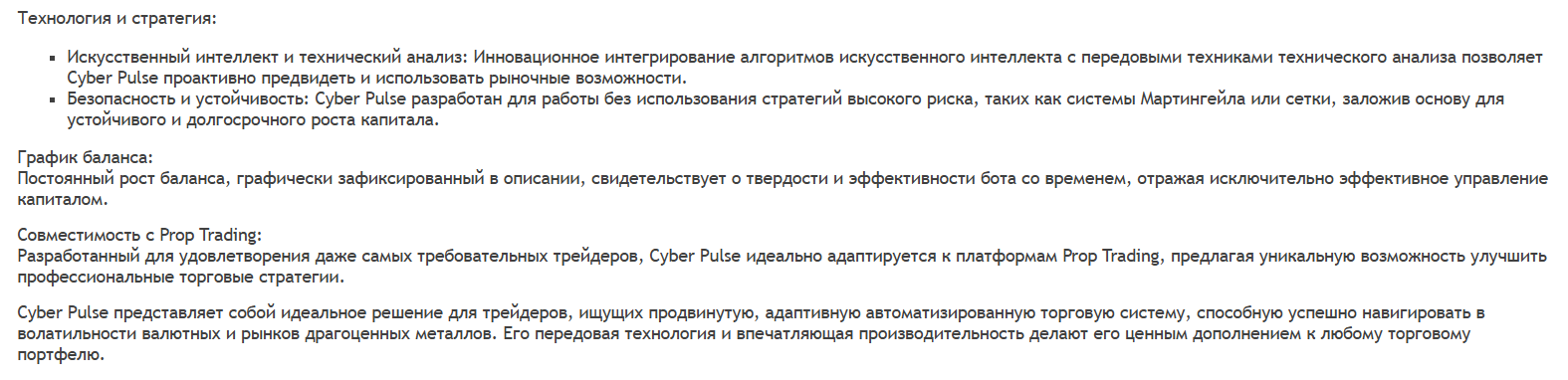 Все это не делает Cyber Pulse автоматически скам‑схемой, но сильно снижает доверие к формулировке “безопасный робот с минимальным риском” и делает его инструментом, требующим самостоятельной проверки и ручной настройки рисков.
