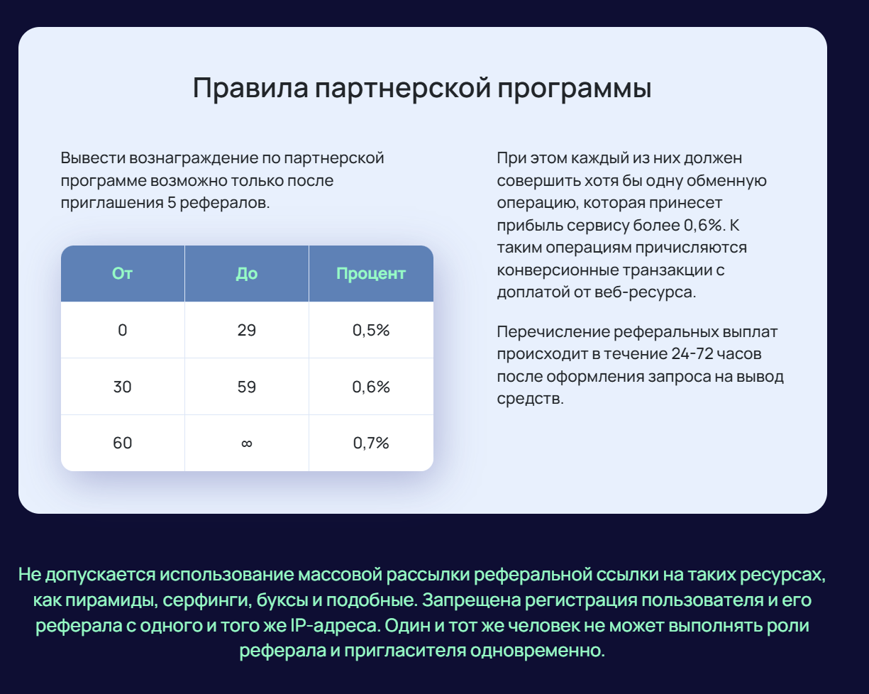 Вывод вознаграждения становится возможен после приглашения минимум пяти рефералов. Вдобавок каждый из них должен провести хотя бы одну операцию с прибылью сервиса более 0,6%. На сайте размещены разделы с правилами обмена и политикой AML/KYC. Прохождение верификации личности при использовании услуг обязательна.