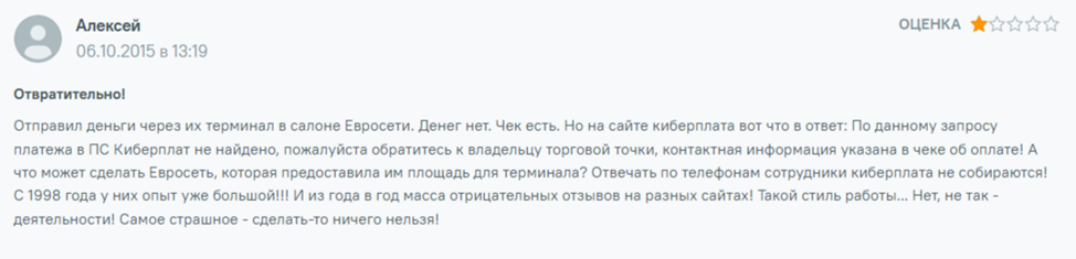 В сети найдены и отрицательные отзывы о CyberPlat Ru. Там пользователи жалуются на плохую работу сервиса. Платежную систему считают скамом, поскольку клиентов просто обманывают на деньги. Ничего вернуть не получается, а поддержки у пользователей нет.
