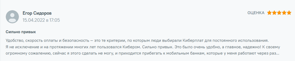 Отзывы о «Киберплат» различные, в том числе и положительные. Пользователи отмечают удобство, скорость и безопасность. Они рекомендуют выбирать для финансовых операций этот сервис. В положительных комментариях пользователи отмечают быстрое и безопасное совершение транзакций.