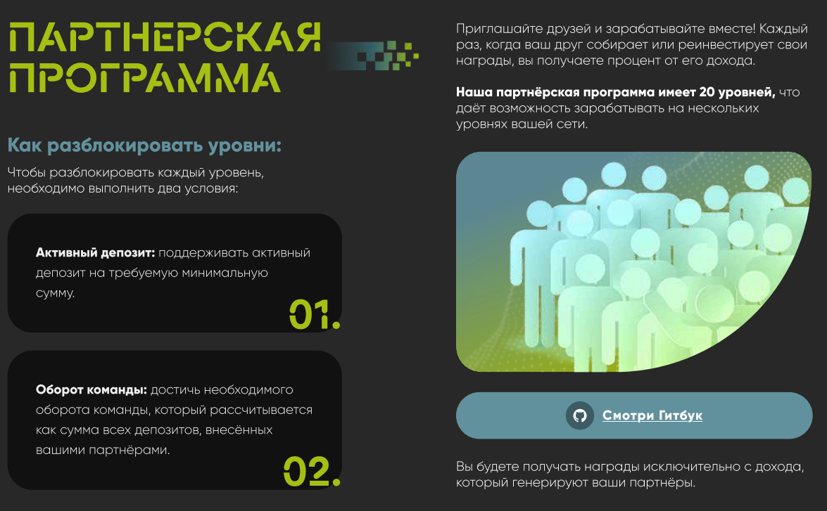Подтверждает тот факт, что Сайрус Финанс – очередная пирамида, и скрытая под видом заработка на блокчейне – многоуровневая рефералка. В ней сразу 20 уровней, которые получают пользователи за активы, а также оборот команды: