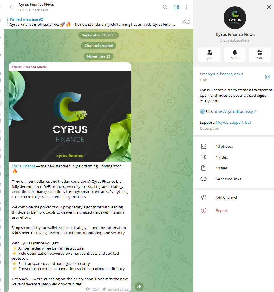 Контактные данные компании сводятся к двум аккаунтам в Тг и Х, а также боту службы поддержки @cyrus_support_bot.
