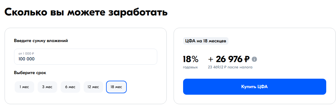 Деньги вкладываются в ЦФА, где эмитент берет их в долг под проценты. По окончанию срока возвращается их номинальная цена плюс доход. Этот доход начисляется в конце срока, без капитализации.
