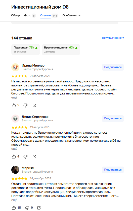 - В сети немало положительных отзывов об инвестиционном доме D8, что говорит о лояльности клиентов и комфортных условиях для торговли.