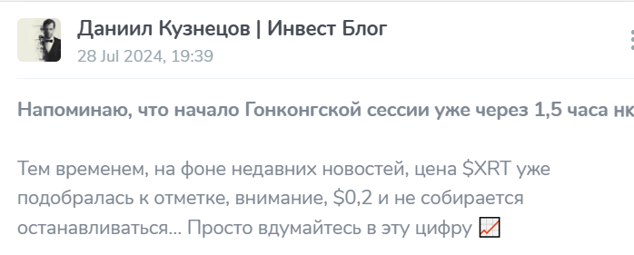 На графике цены криптовалюты XRT мы видим резкое падение ее стоимости в июле 2024 года, то есть именно тогда, когда Данил прекратил вести блог. Вряд ли это совпадение. Скорее всего, «гуру рынка» потерял все вложения, когда цена этого токена обнулилась.