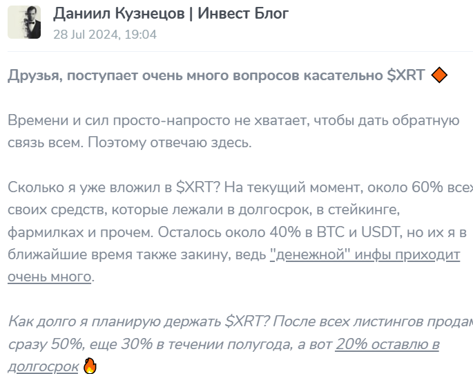В одном из постов Кузнецов призвал клиентов приобретать криптовалюту XRT по причине ее активного роста. Вложения в волатильные активы создают высокий риск потери вложенных средств, но инвестор не предупреждал об этом читателей.
