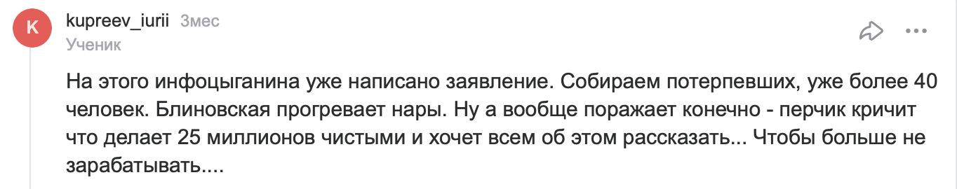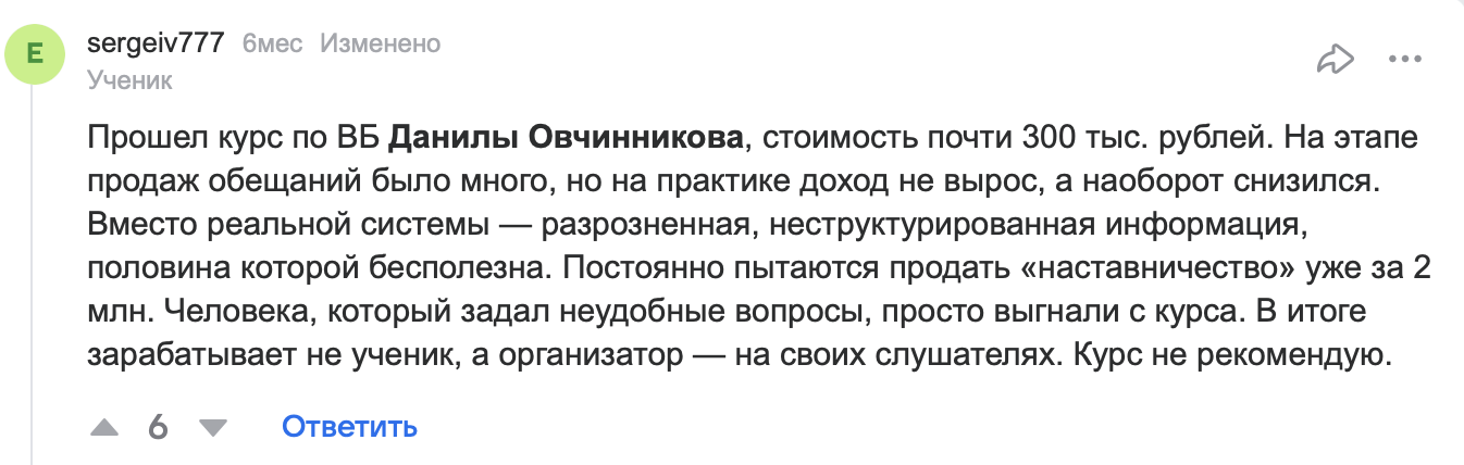 Также людей раздражает стремление Овчинникова продать самый дорогостоящий пакет и навязать личное менторство. В отдельных комментариях прямо пишут, что Данил Овчинников — инфоциган, и связываться с его школой опасно.