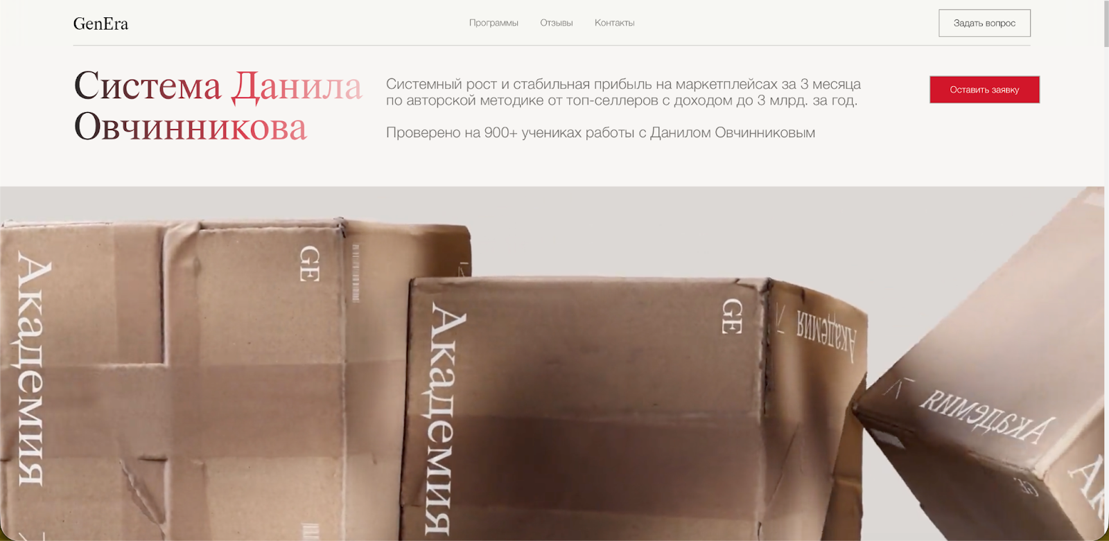 Сайт Gen era ru является главным двигателем продаж для Овчинникова. Здесь опубликована вся основная информация по его курсам с описаниями тарифов и привилегиями для будущих учеников. Также на сайте есть разделы с отзывами, доверять которым слишком опрометчиво, и контактными данными.