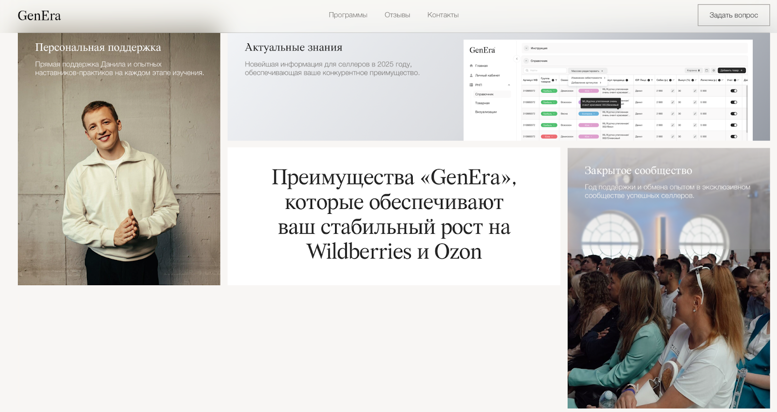 Тема курсов, которые пиарит Данил Овчинников — «Вайлдберриз»: отзывы у них смешанные и чаще негативные. Данный коуч довольно известен в сфере онлайн-торговли и сомнительных инфопродуктов по продажам на маркетплейсах. В своих обучающих материалах Данил делится опытом продвижения бизнеса на известных торговых платформах. В его арсенале — вебинары, модули обучения и сервисы вроде Gen Era ru.