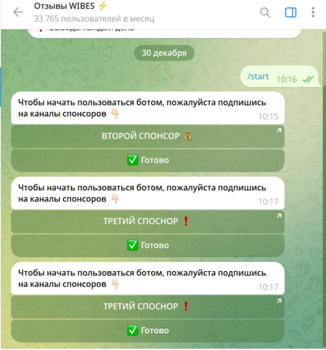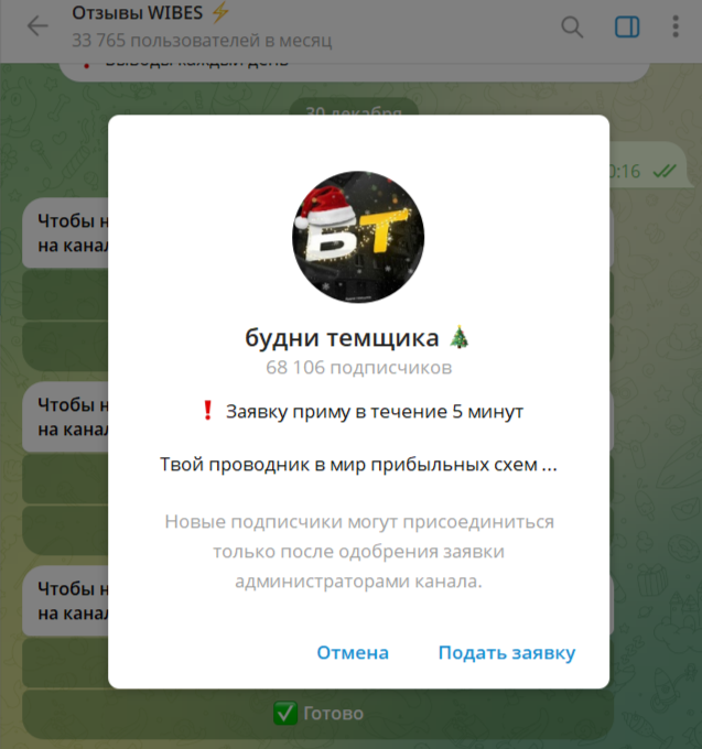 Можно предположить, что зарабатывает не сам пользователь, а эти самые спонсоры, которые рекламируются через бот в Тг Dark Wibes. На какие телеграмм-каналы предлагают подписываться авторы софта, неизвестно, не указаны даже названия. Например, если тапнуть на третьего спонсора, сразу же перебрасывает на приватное сообщество в Телеграмм «Будни темщика».