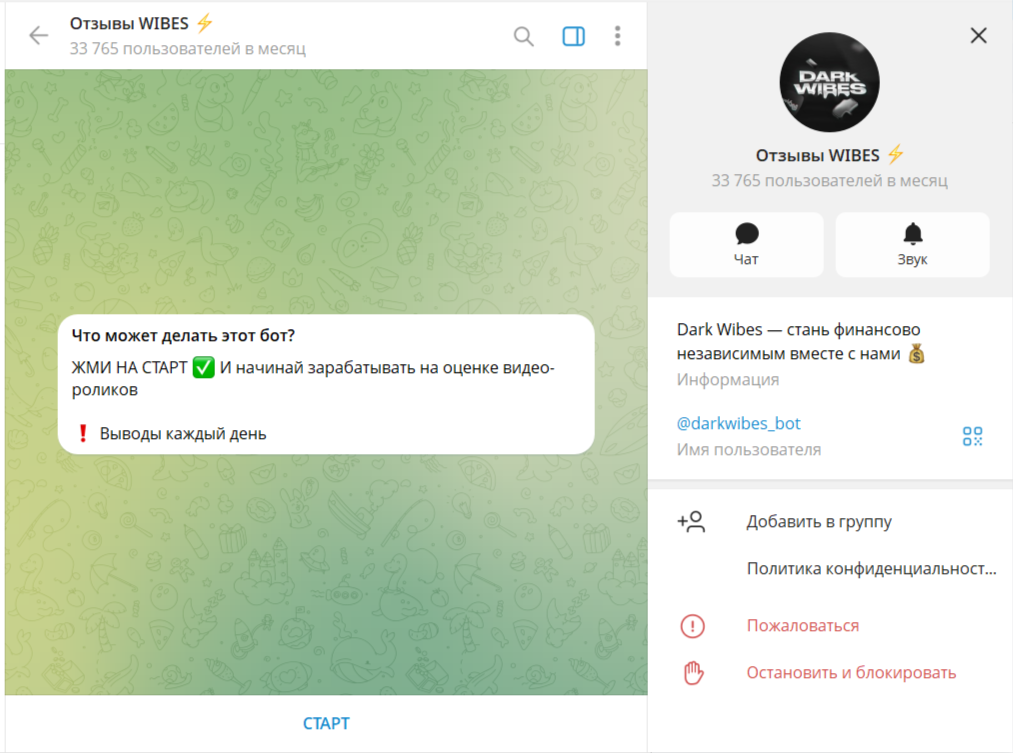В сети отсутствуют отзывы о Dark Wibes Bot. В этой статье проведем детальный анализ бота, рассмотрим его функциональные возможно. Также выясним, можно ли заработать с помощью софта.