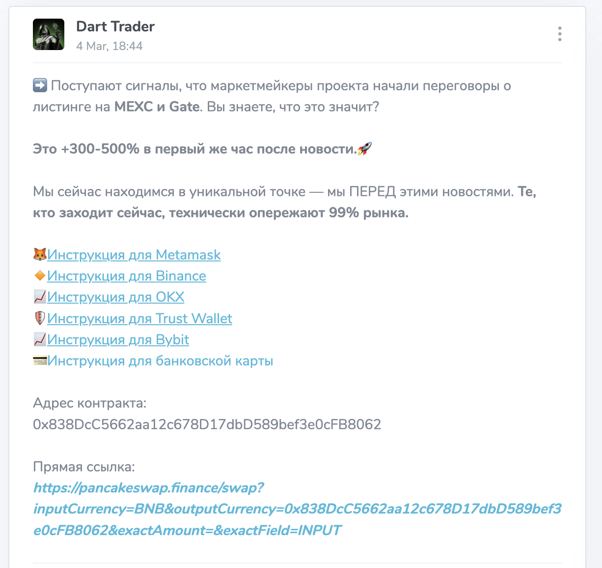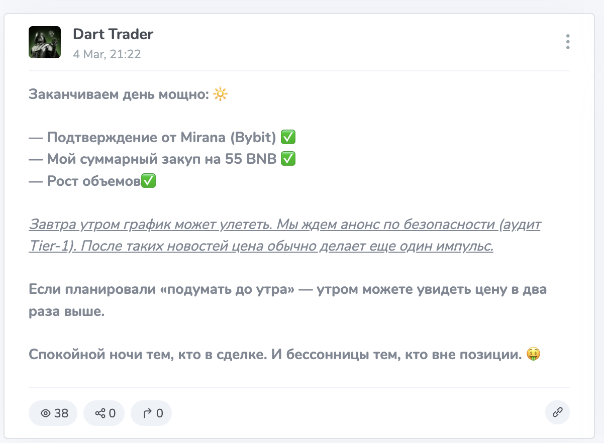 Основная площадка — телеграм-канал, где публикуются торговые идеи по криптовалютам и иногда по акциям с повышенной волатильностью. Формат достаточно знакомый рынку. Короткий пост с точкой входа, указанием направления и целями по прибыли. Иногда добавляется стоп, иногда делается акцент только на потенциальном проценте роста.
