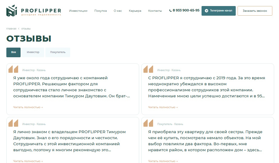 На официальном сайте PROFLIPPER и в Телеграмм канале отзывы о компании и ее руководителе Тимуре Рашитовиче Даутове только положительные. Но по-другому быть и не может, так как комментарии туда попадают после модерации.