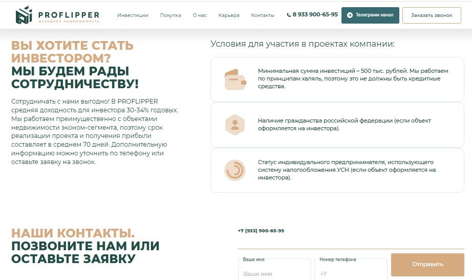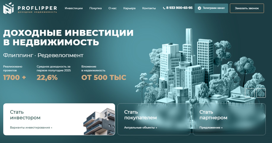 PROFLIPPER приглашает частных инвесторов зарабатывать на недвижимости. Фирма обещает прозрачные условия сотрудничества и стабильный доход.
