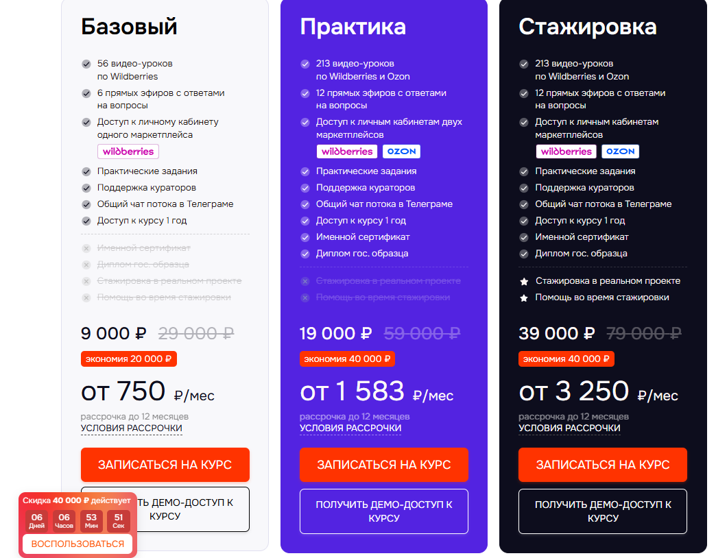 “Курс по системному маркетингу на Wildberries” обойдется по акции 24К руб. Он проходит в формате прямых эфиров, их пять. Доступ ко всем материалам выдается на 1 год плюс 6 месяцев они обновляются. В программу включены такие модули: