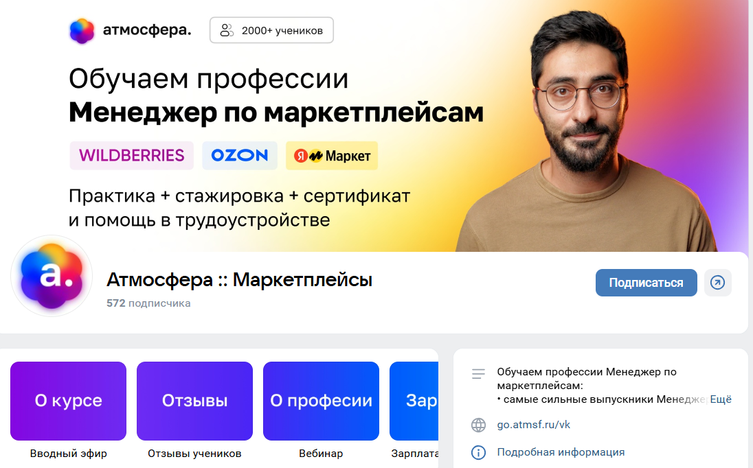 - ВК Атмосфера Маркетплейсы (@atmosfera marketplace), 572 подписчика, создан 7 марта 2022. В основном, используется как площадка для видеоконтента по обучению.