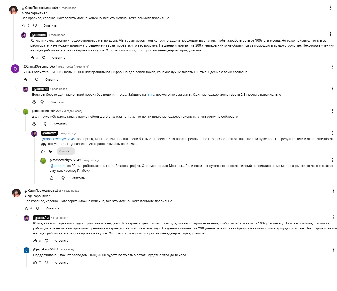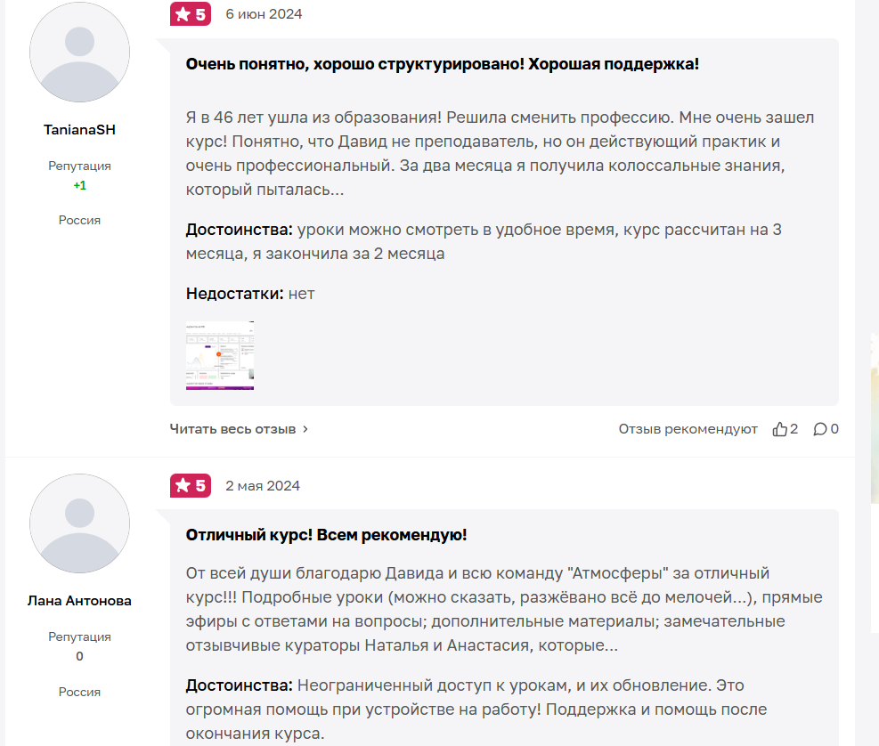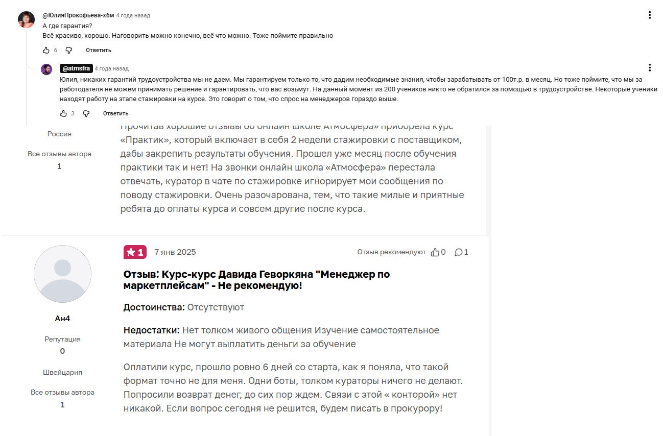 Аналогичные отзывы есть и на других ресурсах. В основном, это сайты отзовики, а также сервисы, которые реализуют курсы школы Атмосфера. Их постоянно мониторят менеджеры проекта.