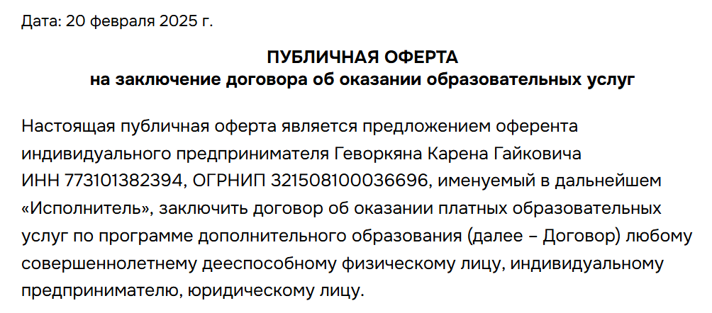 При этом, в публичном поле основателем и экспертом выступает Давид Геворкян. Договор заключается с ИП Карена Гайковича. Как распределены роли внутри проекта — на сайте отдельно не поясняется.