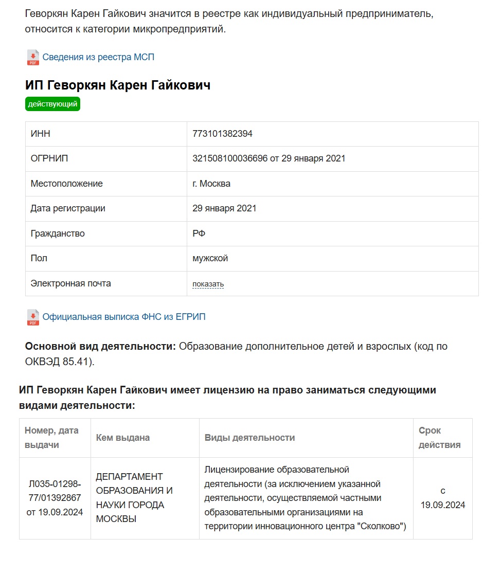 У ИП есть действующая лицензия на образовательную деятельность, выданная девятнадцатого сентября 2024 года Департаментом образования Москвы. То есть, формально школа работает легально.