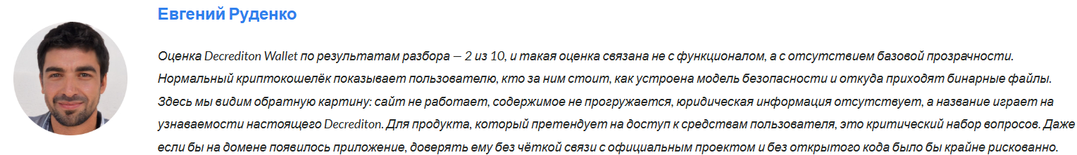 Как таковых на декабрь 2025 года отзывов на крипто-кошелек нет. При этом в интернете опубликованы экспертные оценки независимых аудиторов. Их немного, но существующие характеризуют Decrediton Wallet только с негативной точки зрения. У пользователей возникает много вопросов к честности и надежности сервиса. Один из экспертов акцентирует внимание на отсутствии «базовой прозрачности», а именно: