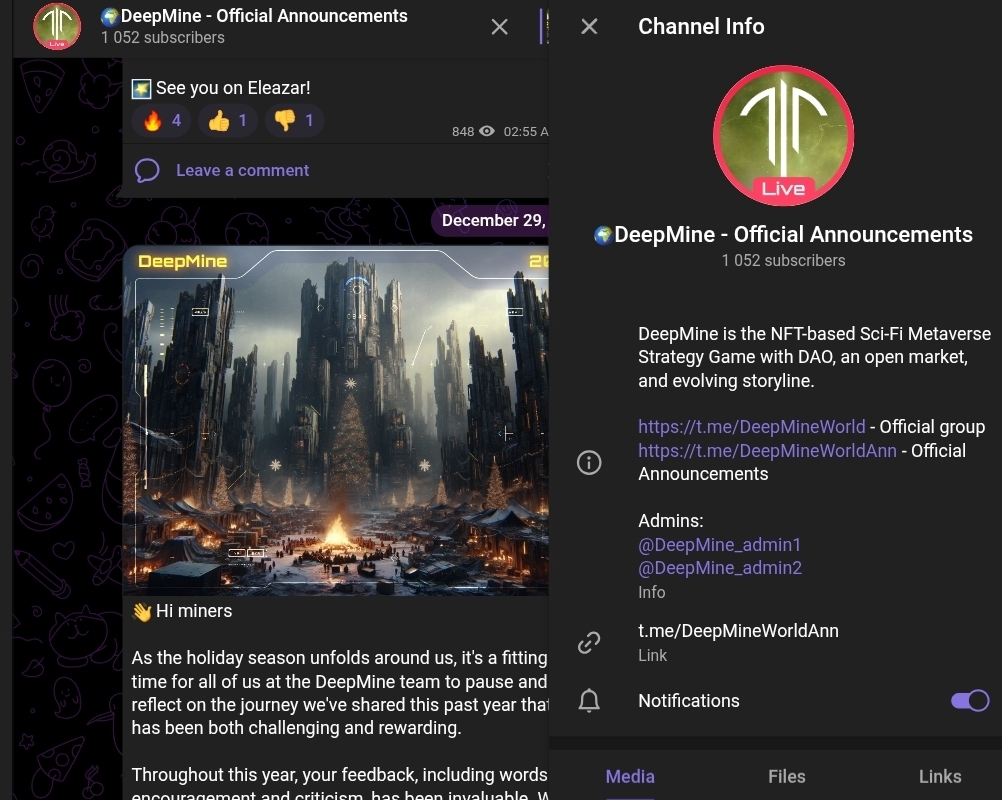 - официальная коммуникация в канале DeepMineWorldAnn фактически прекратилась после января 2023 года, более двух лет проект жил без новых постов;