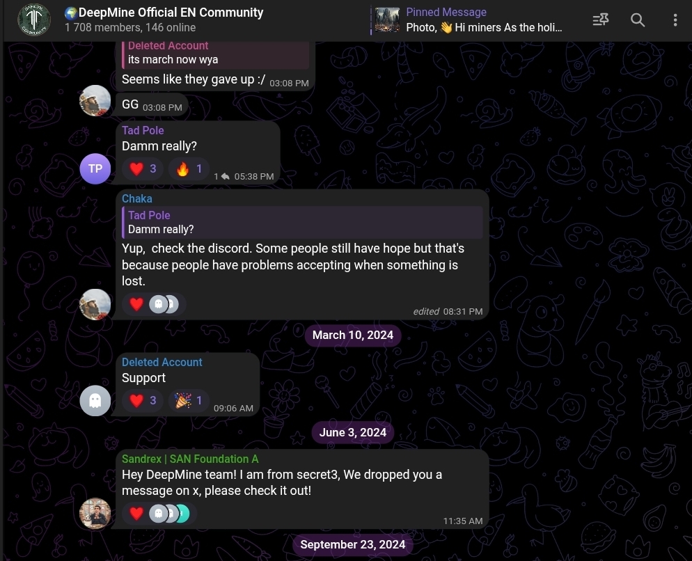 Большинство актуальных отзывов Deepmine носят негативный характер. Однако есть пользователи, которые верят, что проект начнет заново функционировать. В публичном телеграм чате можно заметить обсуждения от 2024 года, где подобных людей называют “не умеющими проигрывать”, потому что они вложили крупную сумму средств и не могут смириться со сливом депозита.