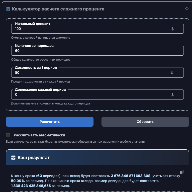 Доходность «майнинга» на площадке составляет около 30-40% в сутки с учетом комиссии сервиса в 10%. Таким образом, можно понять, что за день «чистый доход» составляет около 50%. В связи с этим авторам вообще незачем было бы предоставлять мощности в субаренду, ведь их бизнес масштабировался бы просто семимильными шагами. Например, можно посчитать сколько бы принесли 100 баксов за 2 месяца работы (именно столько функционирует сервис) авторам с доходностью 50% в сутки.