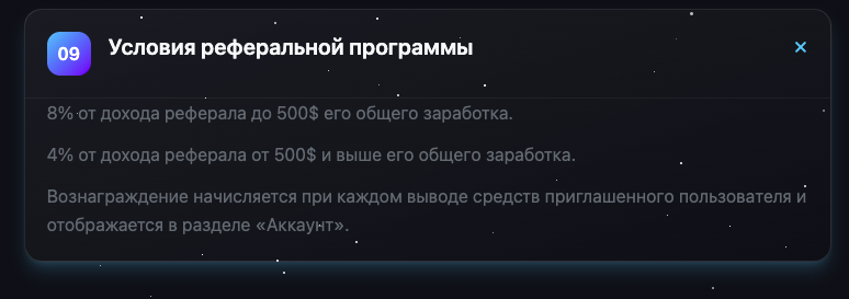 Таким образом авторы сами рушат свою легенду о мощностях и работе проекта в целом. Получается, что всего 9 пользователей могут войти в проект при выборе минимального тарифа и все мощности сети будут использованы. Можно предположить, что авторы проекта говорят о возможностях майнинга Биткоина. Только в этом случае ни о каких 2 тысячах рублей в день с 50 Th/s речи идти не может. Само собой, никакого майнинга на сервисе нет, он является обычным ХАЙПом. На это указывает, в том числе и жирная рефералка: