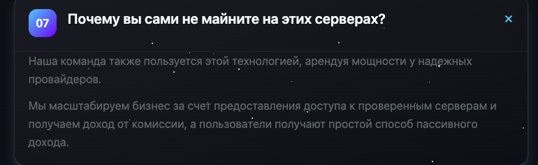 Ну и самое нелепое в работе сервиса – легенда, в которой говорится, что фактически мощности сдаются в субаренду, что авторы просто масштабируют свой бизнес за счет сдачи мощностей, но при этом и сами арендуют их у надежных провайдеров.
