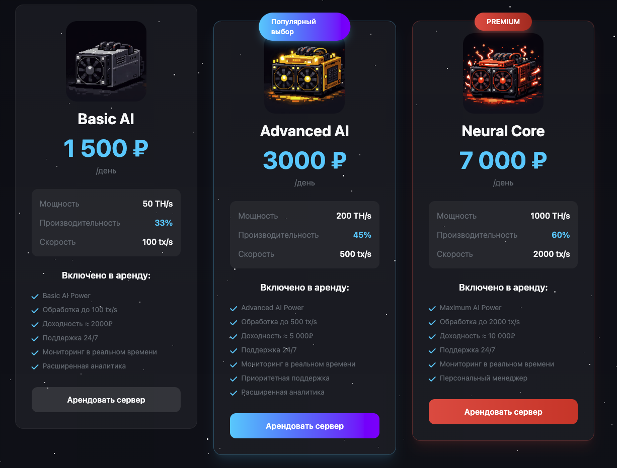 Только при этом мощность сети составляет 450 TH/s, что в 2,5 раза ниже мощности всего 1 Antminer U3S23H, который выдает 1 160 TH/s. Конечно, информации о том, с каким алгоритмом работает сервис, не предоставляется, поэтому даже 450 Th/s могли бы быть достаточно неплохим показателем. Но если посмотреть тарифы, то можно увидеть, что пользователям предлагают арендовать от 50 TH/s. В максимальном тарифе хэшрейт доходит вообще до 1 тысячи TH/s.