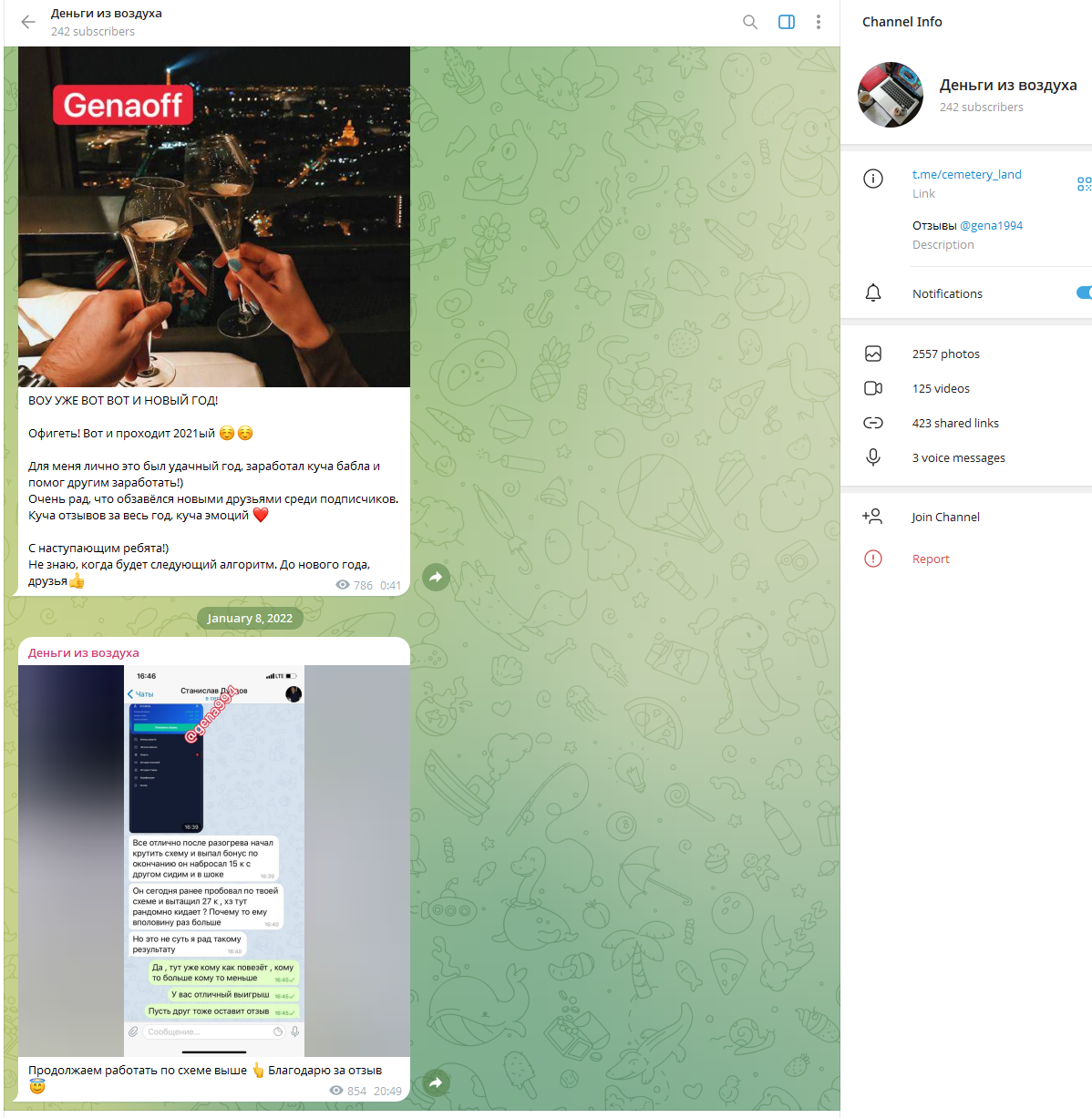 Каналы в Тг Деньги из воздуха (Moneyairs и cemetery land) вели разные авторы – VladSnak59 и gena1994, но суть работы у них была одна. В связи с этим мы склонны считать, что это просто два клона одного проекта, поэтому оба рассмотрим в рамках одного обзора.