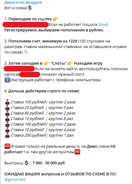 На обоих каналах авторы выкладывали ссылку на казино (вероятнее всего, фейковое), а также информацию о том, как можно заработать гарантированно на определенном слоте.
