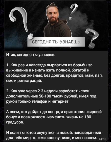 Далее приходит сообщение о том, что с помощью канала «Деньги на коротких видео» в Телеграм Артем может научить зарабатывать все те же ₽2,000,000 меньше чем за месяц – и готов это якобы доказать. Заявляется, что уже в первый день обучения новичок узнает, как
