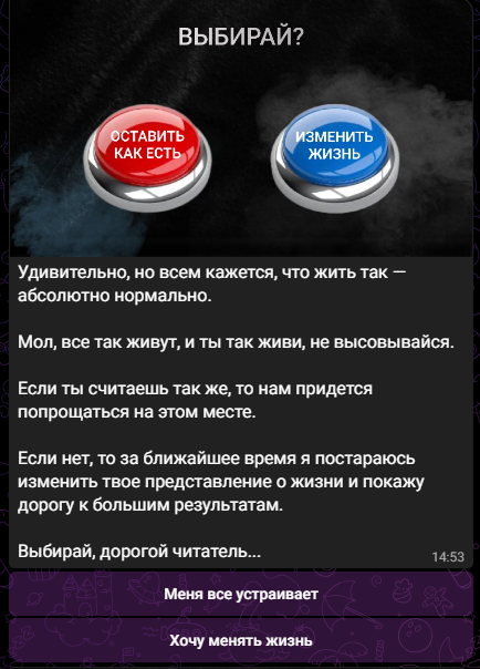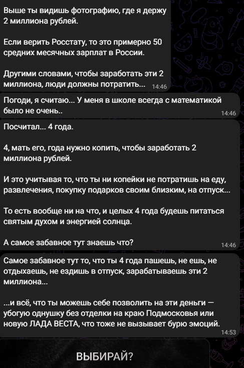 В первом сообщении на канале «Деньги на коротких видео» Артем напоминает, что ₽2,000,000 – это примерно 50 средних месячных зарплат по России. Чтобы заработать эти деньги, обычному человеку потребуется четыре года – при условии любых трат даже на вещи первой необходимости. Также админ акцентирует внимание, что на эти деньги получится купить только «убогую двушку без отделки на краю Подмосковья или новую Лада Веста». Далее Артем просит выбрать – считает ли читать, что так живут все, и это нормально, или готов менять свою жизнь к лучшему.