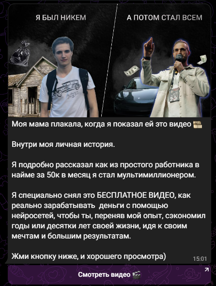 Последнее сообщение, которое приходит от бота, перенаправляет пользователя на сайт, продвигающий обучающий курс. Новичку рекомендуют посмотреть бесплатное видео, в котором Артем рассказывает, как из работника в найме за ₽50,000 стал мультимиллионером с помощью нейросетей.