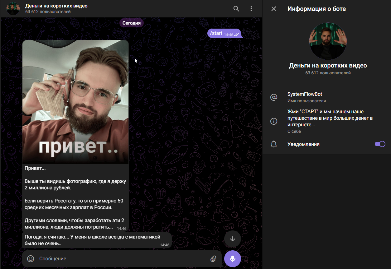У бота SystemFlowBot на декабрь 2025 года более 63 000 пользователей. Хоть дата регистрации алгоритма и неизвестна, статистика кажется достаточно успешной. При запуске бота приходит приветственное сообщение с фото админа, на котором он держит в руках ₽2,000,000.