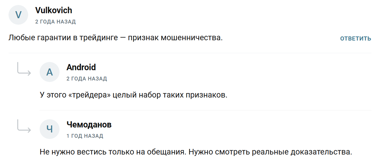 - отсутствуют позитивные отзывы о работе с трейдером.
