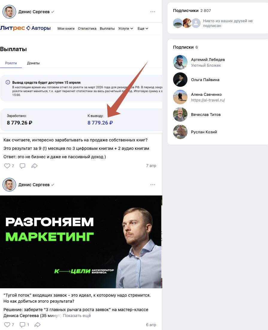 На ВК-страницу «Денис Сергеев» @ Sergeev79 подписаны 2,8 тысяч пользователей соцсети. Контент в ленте такой же, как и в ТГК. Публикации собирают по 5–10 лайков и до 3 комментариев.