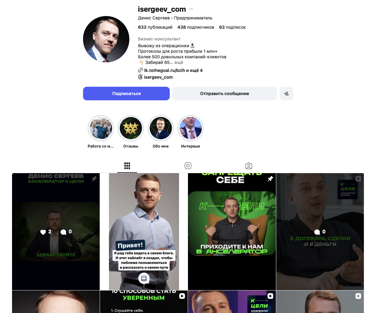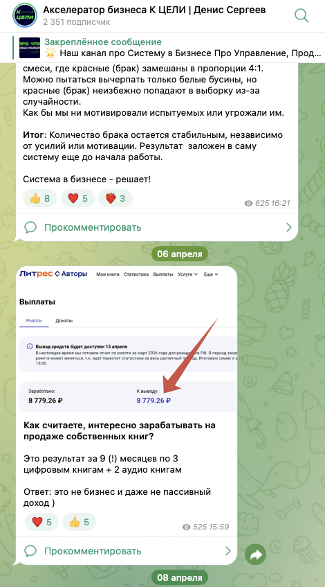 На телеграмм-канал «Акселератор бизнеса к цели Денис Сергеев», находящийся по адресу @ Tothegoalru, по состоянию на 29 апреля 2026 года подписаны 2,35 тысячи пользователей. Публикации в ленте получают по 500–700 показов и 10–20 реакций.