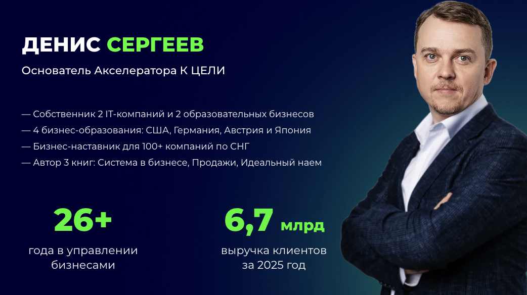 Денис Сергеев — консультант и бизнес-тренер. Утверждает, что занимается предпринимательством более 26 лет и является наставником руководителей свыше сотни компаний по СНГ.