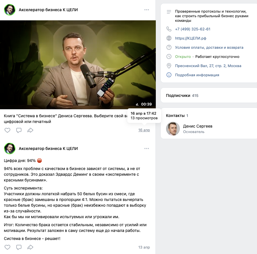 Другая страница эксперта в ВК называется «Акселератор бизнеса к цели» и находится по адресу @ Tothegoal2035. Она насчитывает 415 подписчиков.