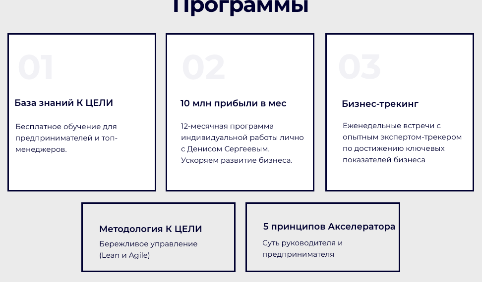 Денис Сергеев предлагает помощь компаниям, владельцы которых желают улучшить управленческие навыки руководителей. На апрель 2026 года он проводит тренинги в соответствии с пятью программами: