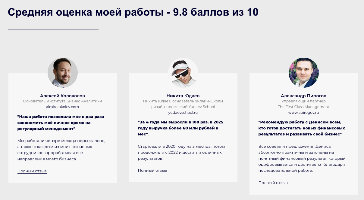 В качестве доказательств полезности своих услуг эксперт разместил у себя блок с фидбэком. Полного доверия эти отзывы о программах по ведению бизнеса Дени Сергеева не внушают. Сообщения вполне могут быть написаны по просьбе организатора проекта.